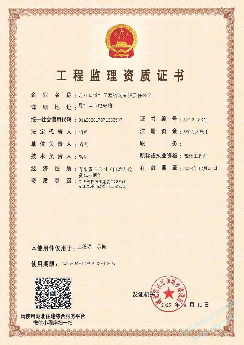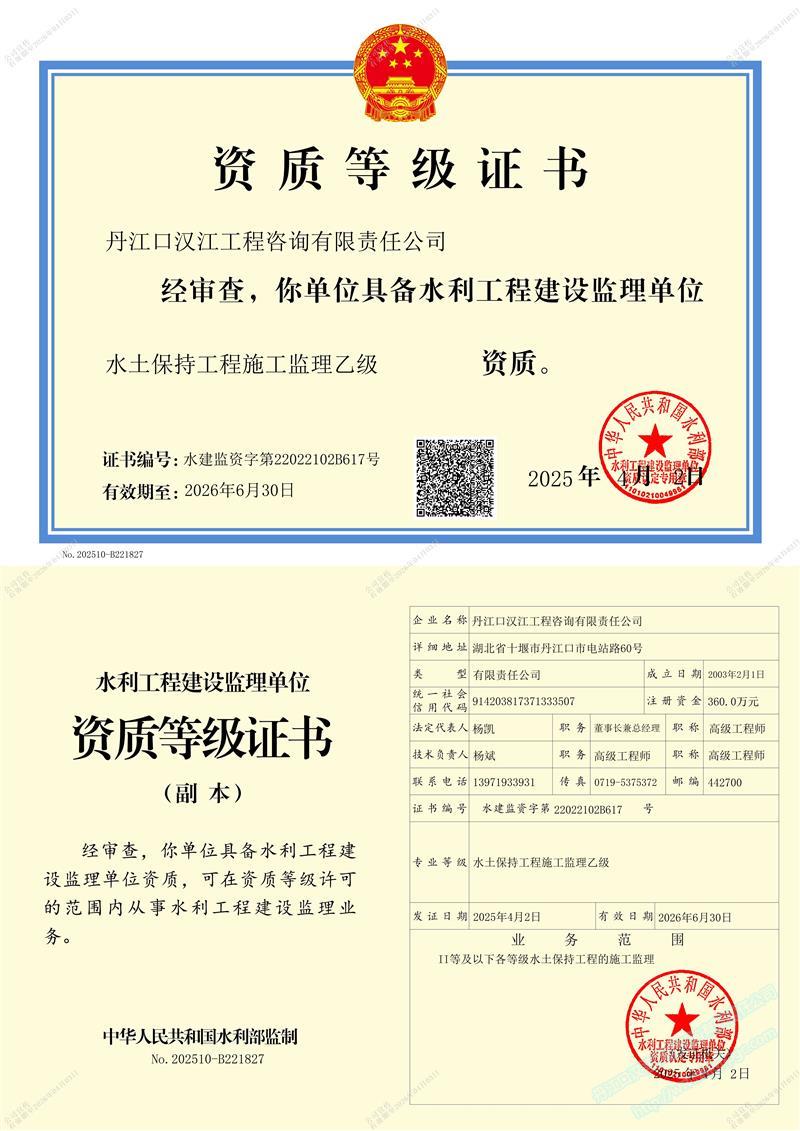 丹江口漢江工程咨詢有限責任公司 (原漢江綜合開發公司水利水電監理中心)成立于 1989年3月,1993年6月經水利部審批成為首批注冊監理單位 (隸屬于長江水利委員會), 注冊資本 360萬元 。公司位于湖北省十堰市丹江口市電站路。公司目前擁有水利部頒發的 水利工程施工監理甲級 、 水土保持工程施工監理 乙 級 資質 ;住建部頒發的 房屋建筑 、 市政公用工程監理 乙 級資質 。 可獨立承擔 各類水利水電工程 、 一般工業與民用建筑工程監理 , 土地整治 , 招標代理 、 技術咨詢 等業務。公司實行董事會領導下的總經理負責制,下設辦公室、經營部、財務部、工程技術部等職能部門。…… [查看詳細]